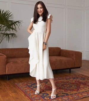 يتميز الفستان بقصّة ميدي، أي أنه يصل إلى ما بين الركبة والكاحل، ما يوفر توازنًا مثاليًا بين الراحة والأناقة. هذا الطول مناسب لمختلف المناسبات، من الحفلات إلى حفلات الكوكتيل، وحتى المناسبات اليومية.