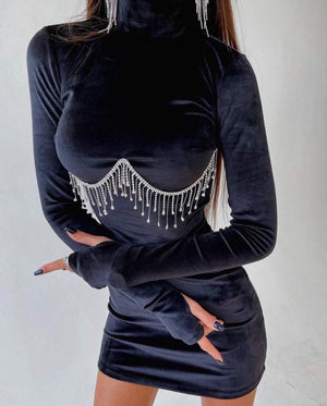 هذا الفستان القصير المزين بالشراريب وأحجار الراين هو الخيار الأمثل للمرأة التي ترغب في التميز وإضفاء لمسة من التألق على أي مناسبة احتفالية. مع اختيار الإكسسوارات المناسبة، سيضمن هذا الفستان إطلالة لا تُنسى.