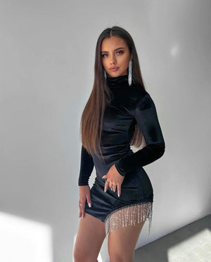 هذا الفستان القصير المزين بالشراريب وأحجار الراين هو الخيار الأمثل للمرأة التي ترغب في التميز وإضفاء لمسة من التألق على أي مناسبة احتفالية. مع اختيار الإكسسوارات المناسبة، سيضمن هذا الفستان إطلالة لا تُنسى.