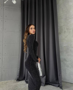 Rochia lunga din lurex cu maneci lungi si croiala mulata pe corp emana eleganta si rafinament. Iata o descriere detaliata a acestei rochii: