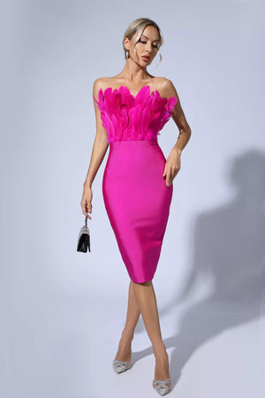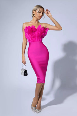الفستان القصير ذو الريش على الصدر والقصة الضيقة خيار جريء وجذاب، مناسب للمناسبات الاحتفالية أو الحفلات. إليكِ وصف أكثر تفصيلاً لهذا الفستان: