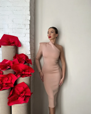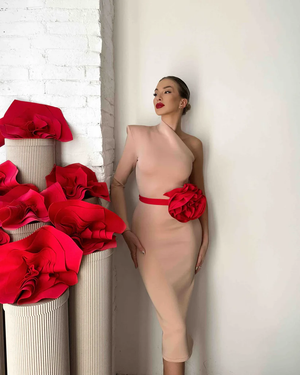 هذا الفستان الميدي بأكمامه الواحدة وزهرته التي تُربط عند الرقبة أو الخصر، مثالي للمناسبات الخاصة والحفلات وحفلات الكوكتيل والمناسبات الرسمية. تصميمه الفريد وتفاصيله الأنيقة تضمن لكِ إطلالة مميزة لا تُنسى، تجذب الأنظار.