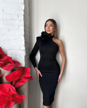 هذا الفستان الميدي بأكمامه الواحدة وزهرته التي تُربط عند الرقبة أو الخصر، مثالي للمناسبات الخاصة والحفلات وحفلات الكوكتيل والمناسبات الرسمية. تصميمه الفريد وتفاصيله الأنيقة تضمن لكِ إطلالة مميزة لا تُنسى، تجذب الأنظار.