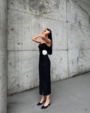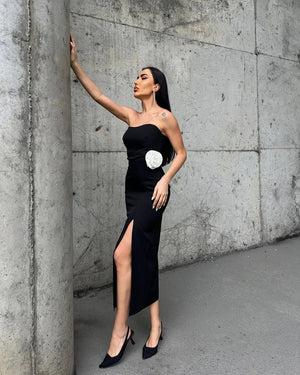 الفستان الملائم، بدون أكمام وبشق على الساق، ومزين بزهرة على الخصر، خيار ساحر وجذاب للمناسبات الخاصة. إليكِ وصف مفصل لهذا الفستان الأنيق: