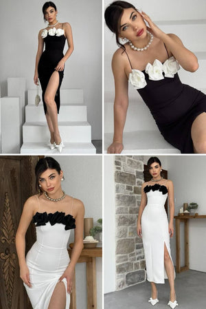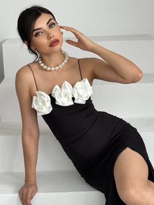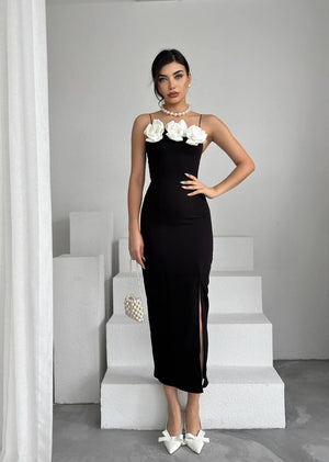 هذا الفستان الميدي بحزامين وثلاث ورود على الصدر وشق على إحدى الساقين، خيارٌ ساحر وأنيق للمناسبات الخاصة. إليكِ وصفٌ أكثر تفصيلاً لهذا الفستان: