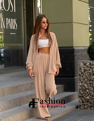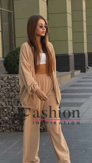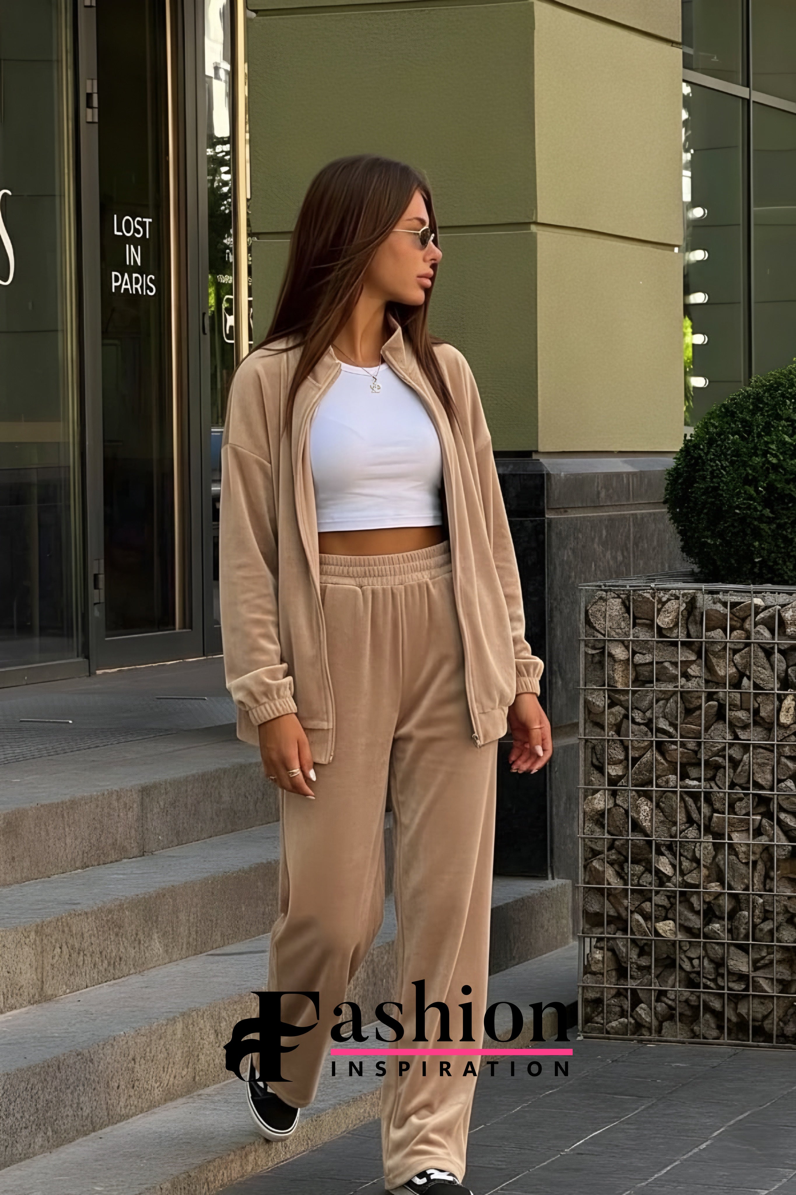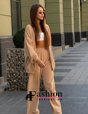 Treningul Noa Bej îmbină un look modern cu un nivel ridicat de confort. Conceput din material catifelat, moale și plăcut la atingere, oferă o senzație luxoasă și un aspect elegant chiar și în ținutele casual. Bluza cu fermoar și croi lejer evidențiază talia într-un mod feminin, iar pantalonii largi asigură libertate de mișcare și un efect relaxat & stylish.
