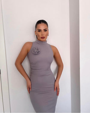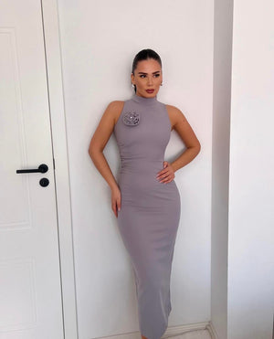 فستان طويل مزين بورود على الصدر خيار أنيق وراقي للمناسبات الخاصة. إليكِ وصف تفصيلي لهذا الفستان: