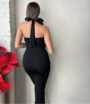 هذا الفستان الميدي الملائم، المزين بوردة تُربط عند الرقبة أو الخصر، مثالي للمناسبات الخاصة والحفلات وحفلات الكوكتيل والعشاءات الرومانسية. تصميمه الراقي وتفاصيله الأنيقة تضمن لكِ إطلالة مميزة لا تُنسى، تجذب الأنظار.