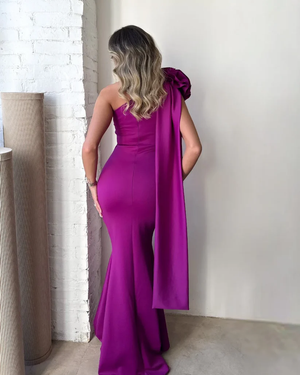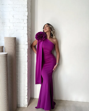 يمكن أن يتراوح لون الفستان بين درجات كلاسيكية كالأحمر، والوردي السلموني، والبنفسجي، وخيارات أكثر إشراقًا أو باستيلية، حسب تفضيلاتكِ وطبيعة المناسبة. هذا الفستان ذو الكتف الواحد والمزين بوردة مثالي للنساء اللواتي يرغبن في إضفاء لمسة من الأناقة والرقي على إطلالاتهن.