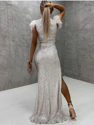يجمع هذا الفستان بين بريق الترتر ورقّة الريش وأناقة الشق الجانبي، ليمنح من ترتديه إطلالةً لا تُنسى. إنه مثالي للسهرات والحفلات الراقصة والحفلات الأنيقة، أو غيرها من المناسبات الخاصة التي ترغبين فيها بالتألق ولفت الأنظار.