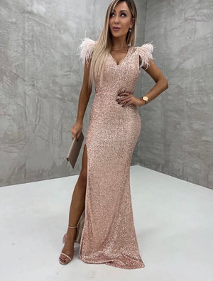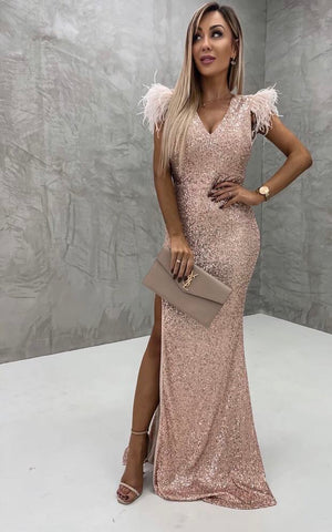 يجمع هذا الفستان بين بريق الترتر ورقّة الريش وأناقة الشق الجانبي، ليمنح من ترتديه إطلالةً لا تُنسى. إنه مثالي للسهرات والحفلات الراقصة والحفلات الأنيقة، أو غيرها من المناسبات الخاصة التي ترغبين فيها بالتألق ولفت الأنظار.