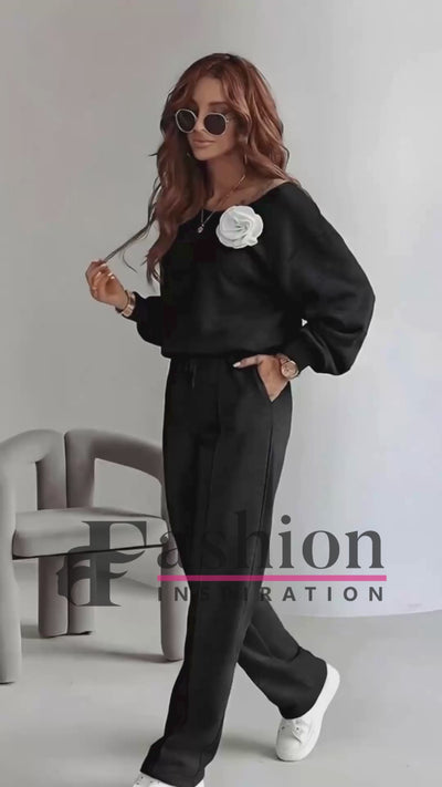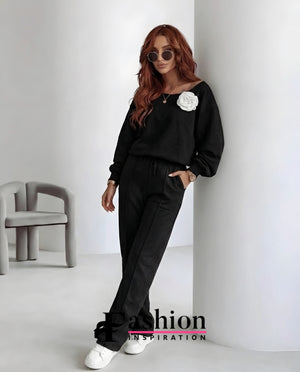**Bluza** din set are o croiala lejera, care asigura confort si libertate de miscare. Realizata dintr-un material moale si placut la atingere, bluza este ideala pentru purtarea de zi cu zi. Elementul care atrage atentia este **trandafirul aplicat** pe partea frontala, un detaliu romantic si elegant, care ofera un accent subtil si feminin. Acest trandafir adauga un plus de rafinament si transforma o piesa simpla intr-una deosebita, ideala pentru a-ti exprima personalitatea si stilul.