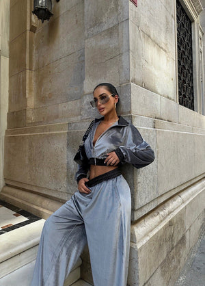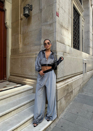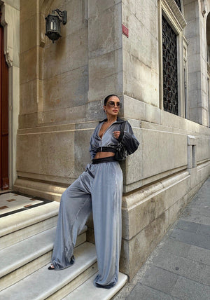 **The long flared velvet trousers** perfectly complement the blouse, adding elegance and fluidity to the silhouette. The flared cut elongates and slims the legs, creating an attractive visual effect.