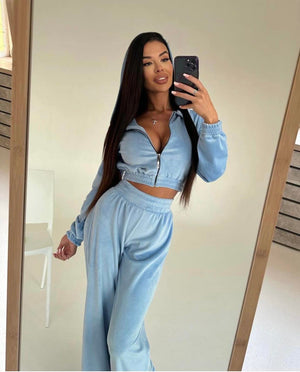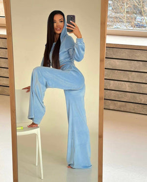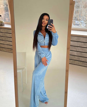 بدلة رياضية نسائية مخملية، تتكون من بلوزة بسحاب وبنطال طويل واسع، خيار أنيق ومريح للغاية، مثالي للنساء اللواتي يرغبن في الجمع بين الفخامة والأناقة العصرية والعملية. تتميز هذه البدلة بتفاصيلها الدقيقة وتصميمها اللافت.