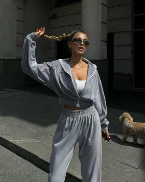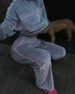 The elastic or adjustable drawstring waist ensures a comfortable and flexible fit, making this tracksuit perfect for a variety of activities, from relaxed walks to casual meetings. The velvet material retains warmth and comfort, making it ideal for cooler days or to add a touch of luxury to any moment of the day.