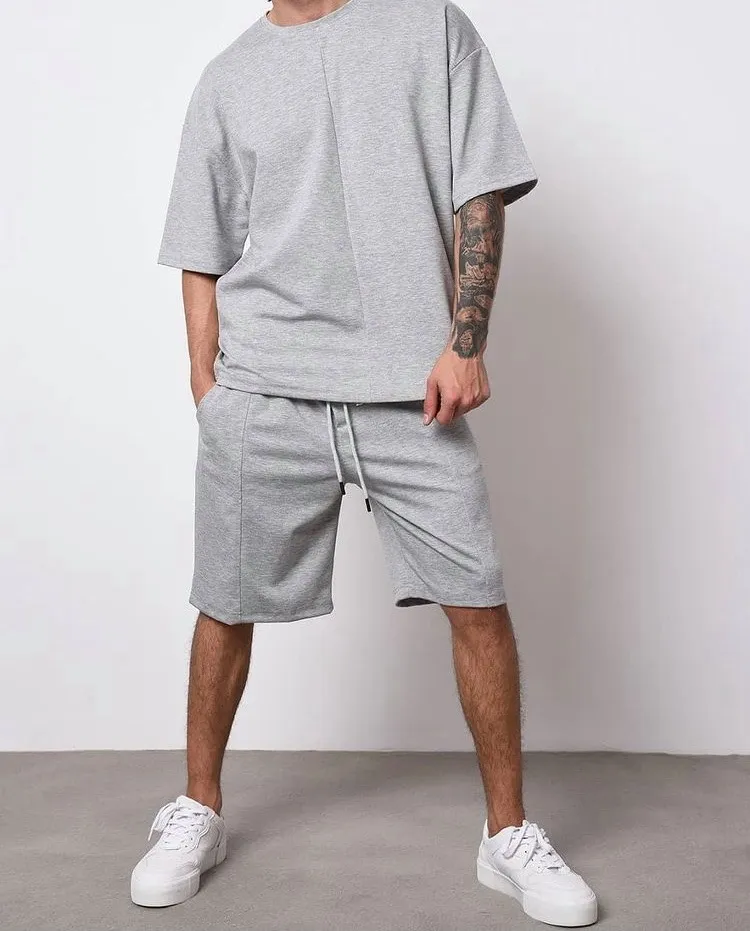 Този мъжки костюм, състоящ се от блуза и шорти с **овърсайз** кройка, е перфектният избор за модерен, непринуден и модерен външен вид. Специално създаден за мъже, които ценят комфорта без компромис със стила, този комплект е идеален за горещи летни дни, почивки или ежедневни градски тоалети.