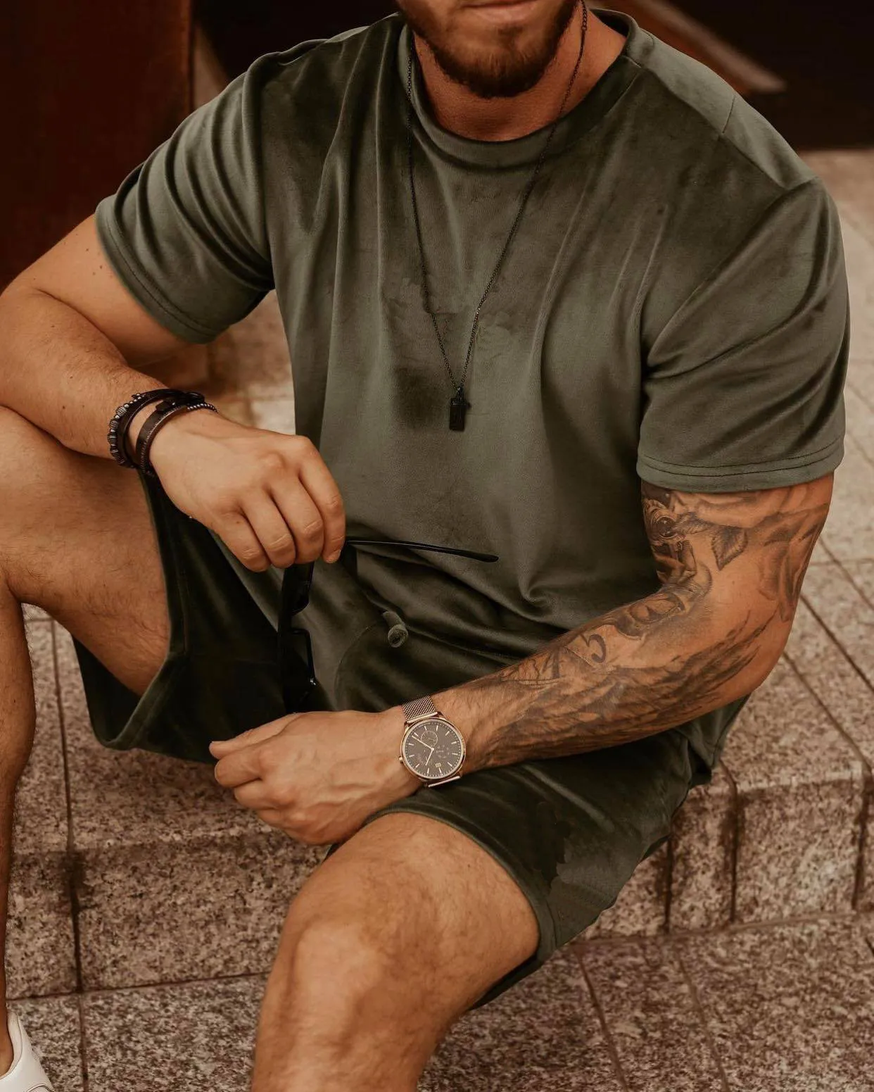 - Кадифеният ансамбъл, състоящ се от тениска и шорти, е смел и елегантен избор за поводи, в които искате да излъчвате изисканост и комфорт едновременно. Ето подробно описание на този монтаж: