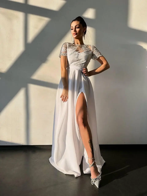 Горната част на роклята е изработена от фина бродирана дантела, създаваща богат и фин детайл. Дантелата добавя нотка женственост и изтънченост, а бродерията може да варира от нежни и романтични шарки до по-сложни и фини детайли.