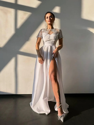 Бродираната дантелена вечерна рокля с широка еластична тафта пола е изискано и елегантно творение, идеално за специални събития или специални вечери. Ето подробно описание на тази изискана рокля: