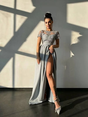Бродираната дантелена вечерна рокля с широка еластична тафта пола е изискано и елегантно творение, идеално за специални събития или специални вечери. Ето подробно описание на тази изискана рокля: