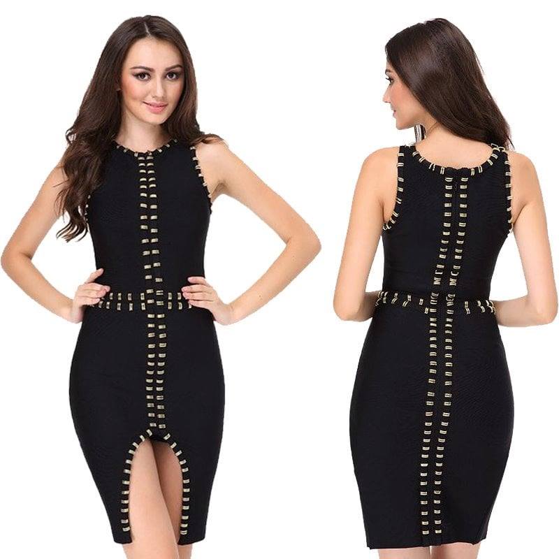 Вталената рокля без ръкави, украсена със сребърни пръстени, е модерен и изтънчен избор, идеален за специални събития или излети в града. Кройката му обгръща силуета, подчертавайки формите по елегантен начин, докато металните детайли предлагат допълнителен блясък и смелост. Гладката текстура на материала и аксесоарът със сребърни пръстени добавят шикозен детайл, превръщайки тази рокля в особено атрактивно и изискано изящно парче.