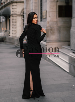 Тази дълга рокля с цепка и апликация роза на рамото е идеална за официални събития като сватби, гала вечери или елегантни партита. Уникалният ѝ дизайн съчетава модерни и романтични елементи, създавайки специален тоалет, който привлича всички погледи.