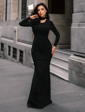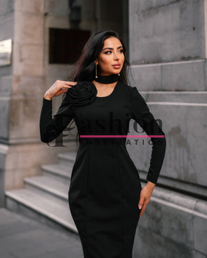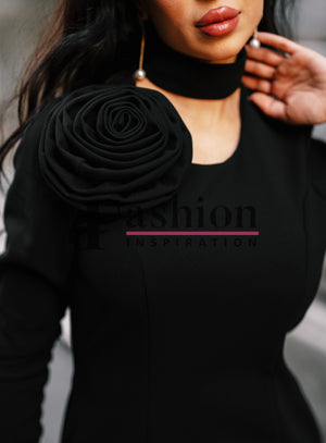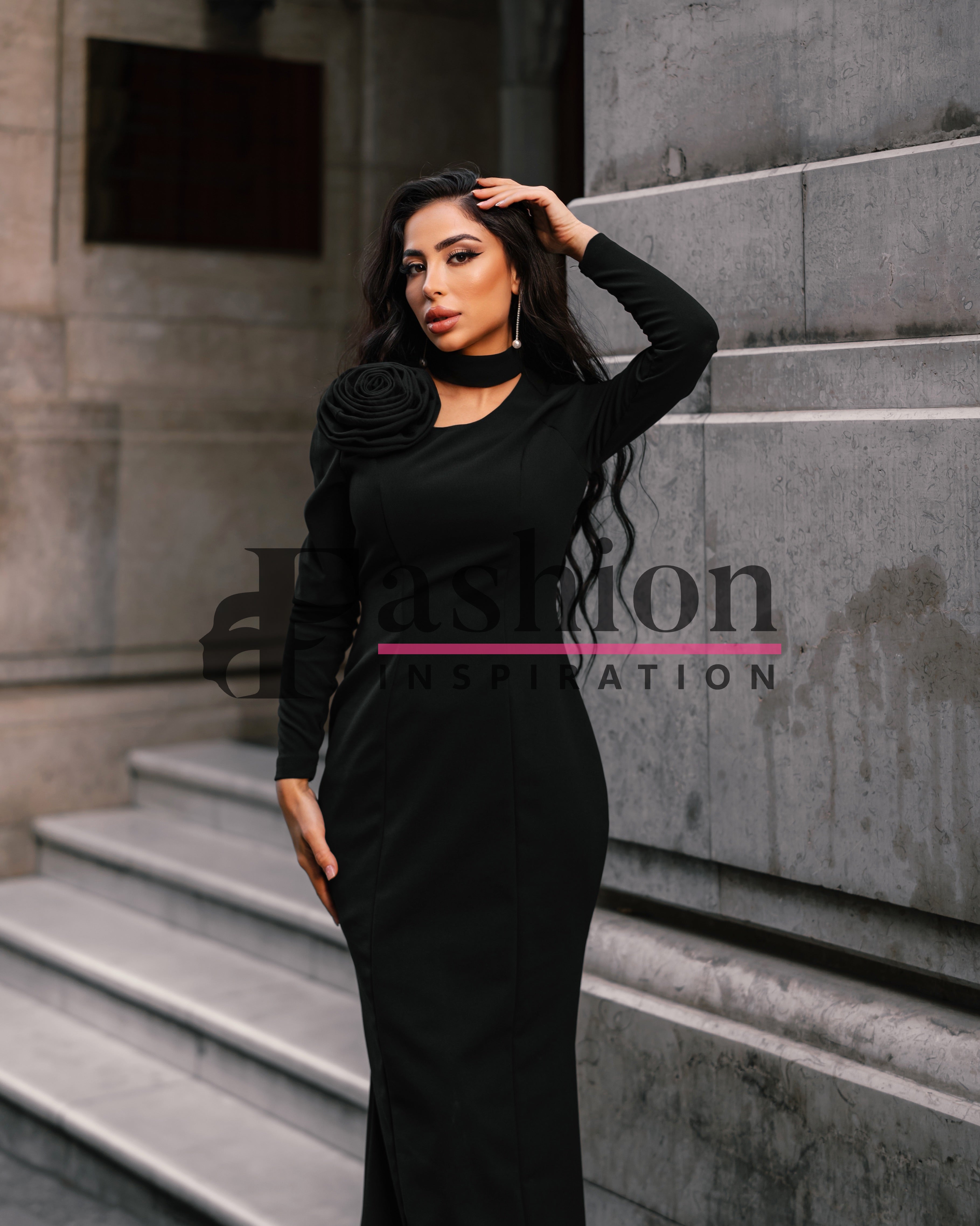 - **Апликация роза:** Декоративна роза е апликирана на рамото на дългия ръкав, добавяйки романтичен и женствен детайл. Розата може да бъде изработена от същия материал като роклята за по-силен визуален ефект.