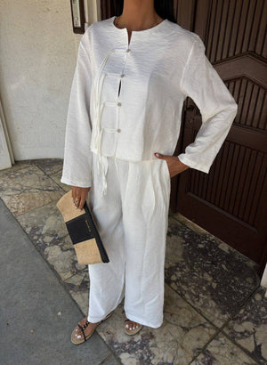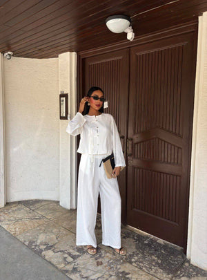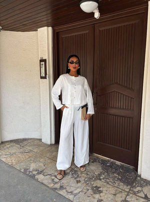 Този елегантен и ежедневен комплект, състоящ се от риза и дълги разкроени панталони, е изработен от материал **ayrobin** , идеален за топлия сезон благодарение на леката, ефирна и изключително удобна текстура.