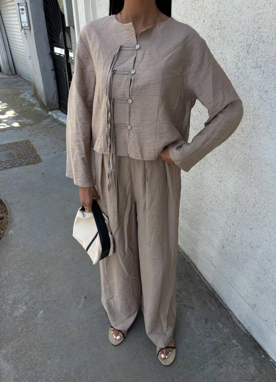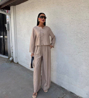 Този елегантен и ежедневен комплект, състоящ се от риза и дълги разкроени панталони, е изработен от материал **ayrobin** , идеален за топлия сезон благодарение на леката, ефирна и изключително удобна текстура.