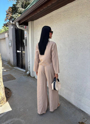 **Разкроените дълги панталони** перфектно допълват комплекта, добавяйки елегантност и оптически удължавайки силуета. Еластичната или дискретно затворена талия предлага комфорт през целия ден, а разкроената кройка осигурява флуиден и изискан ефект с всяка стъпка.