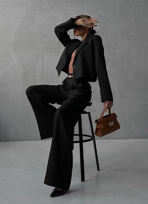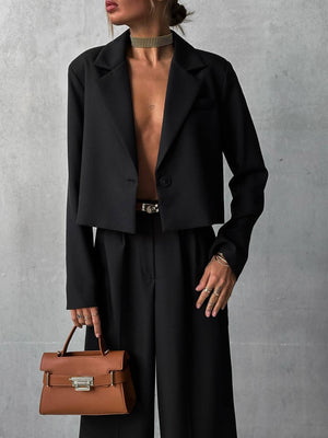 ✔️ Croială: Sacou scurt, pantaloni evazați