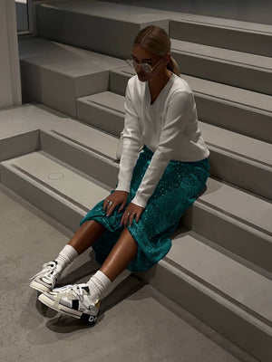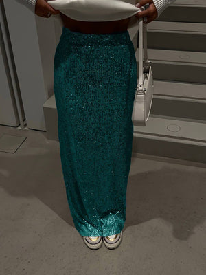 Тази дълга, вталена пола с пайети е очарователен избор, с който да блеснете и да впечатлите на всяко специално събитие. Неговият ярък и бляскав дизайн ще ви накара да се почувствате като истинска дива на вечерта.
