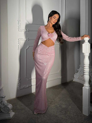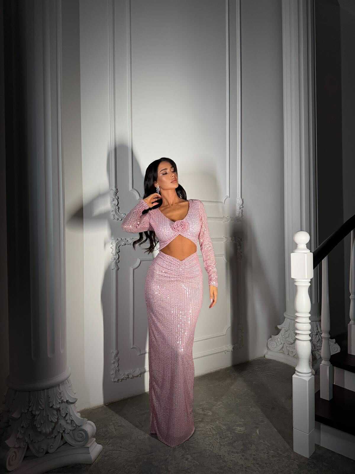 🔸 Пайетиран материал в пудрово розово – Осигурява блясък и текстура, идеален за вечерни събития, партита или бляскави фотосесии.