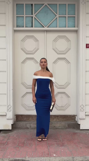 Впечатлява с елегантност и изтънченост. Дългата, права кройка удължава силуета, а белият детайл, наподобяващ шал, на раменете осигурява деликатен и женствен контраст. Идеална за гала вечери, специални събития или елегантни вечери.