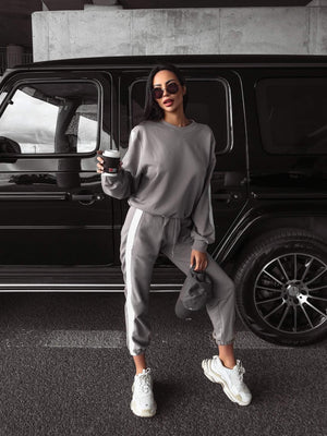 **За него** комплектът може да включва блуза, в спортен стил и леко стеснени панталони, които предлагат модерна и мъжествена визия. Минималистичните детайли, като страничните ивици, допълват специалната и стилна визия.