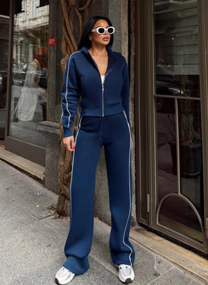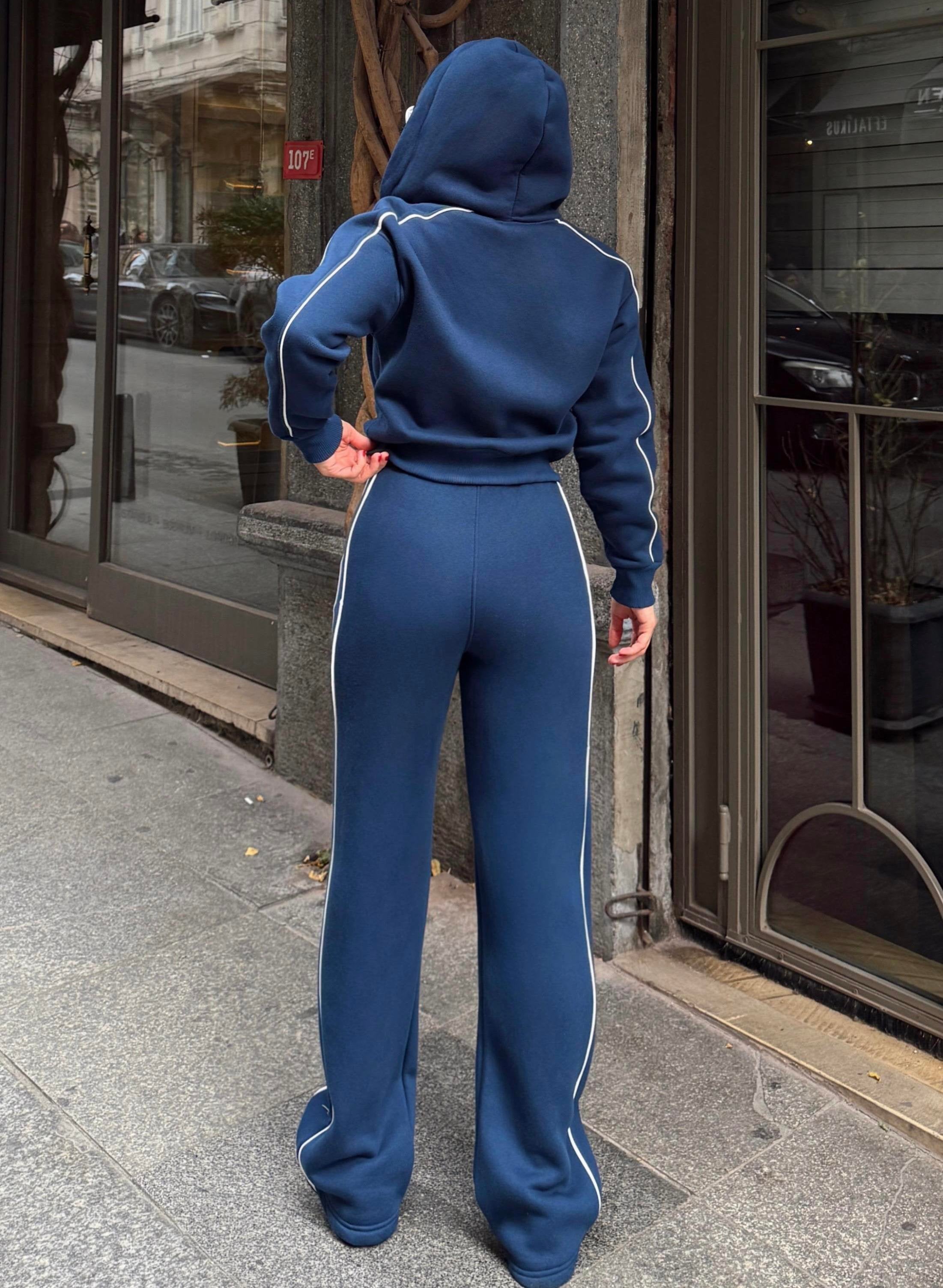 Анцугът Layla Navy е перфектният избор за модерен, удобен и изискан външен вид. Изработен от пухкав материал French Terry , той предлага приятно докосване и комфорт през целия ден. Суитшъртът е с къс дизайн, с цип и качулка, подчертаващи талията, а панталонът е със свободна кройка и еластична талия за перфектно прилягане.