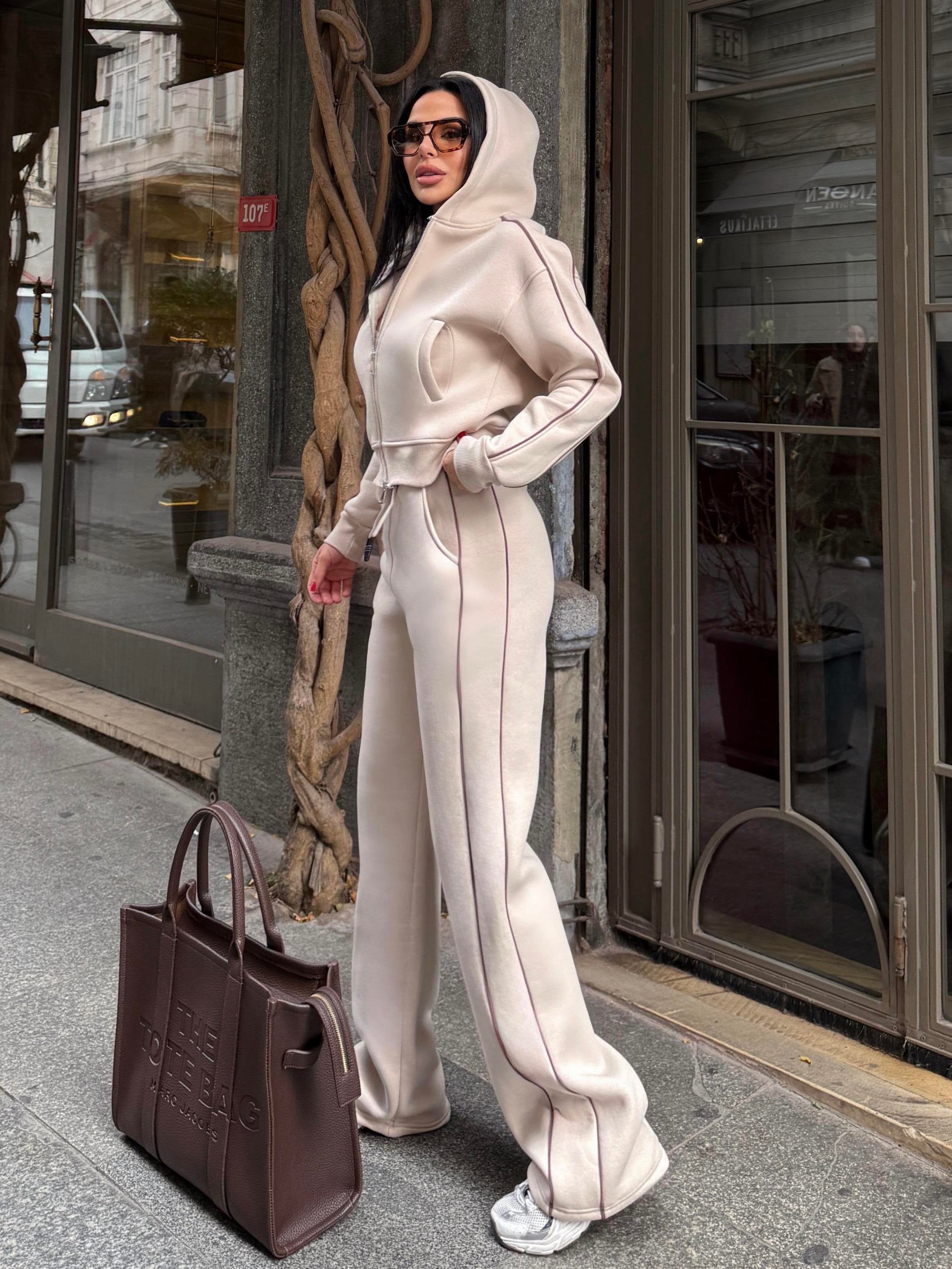 Анцугът Layla Cream е перфектният избор за модерен, удобен и изискан външен вид. Изработен от пухкав материал French Terry , той предлага приятно докосване и комфорт през целия ден. Суитшъртът е с къс дизайн, с цип и качулка, подчертаващи талията, а панталонът е със свободна кройка и еластична талия за перфектно прилягане.