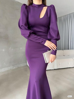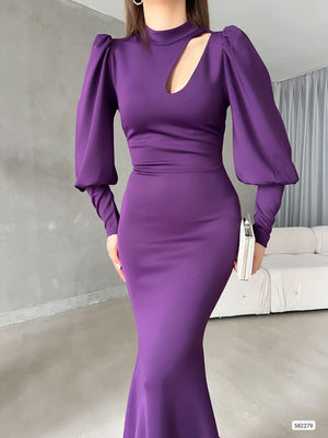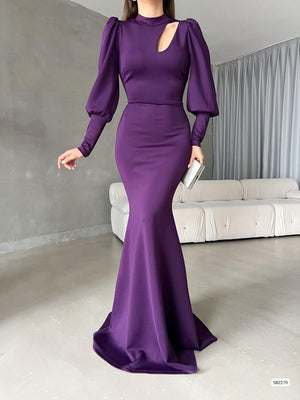 Тази дълга, вталена рокля с дълги ръкави и шлейф е очарователен избор за жени, които искат да впечатлят на специални събития. Внимателно подредена с аксесоари, като искряща чанта и елегантни бижута, тази рокля ще ви осигури незабравимо присъствие.