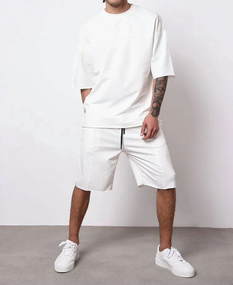 Този мъжки костюм, състоящ се от блуза и шорти с **овърсайз** кройка, е перфектният избор за модерен, непринуден и модерен външен вид. Специално създаден за мъже, които ценят комфорта без компромис със стила, този комплект е идеален за горещи летни дни, почивки или ежедневни градски тоалети.