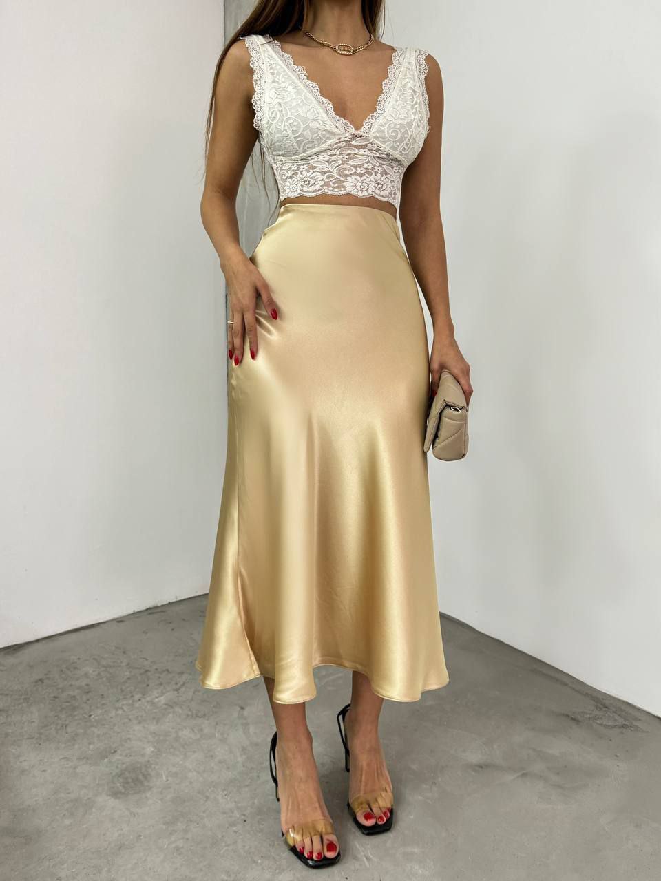 Кройката на полата е midi, което означава, че стига до средата на прасеца, предлагайки перфектен баланс между комфорт и елегантност. Миди дължината е изключително подходяща за официални и ежедневни събития, като ви позволява да се движите свободно и същевременно да изглеждате стилно.
