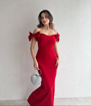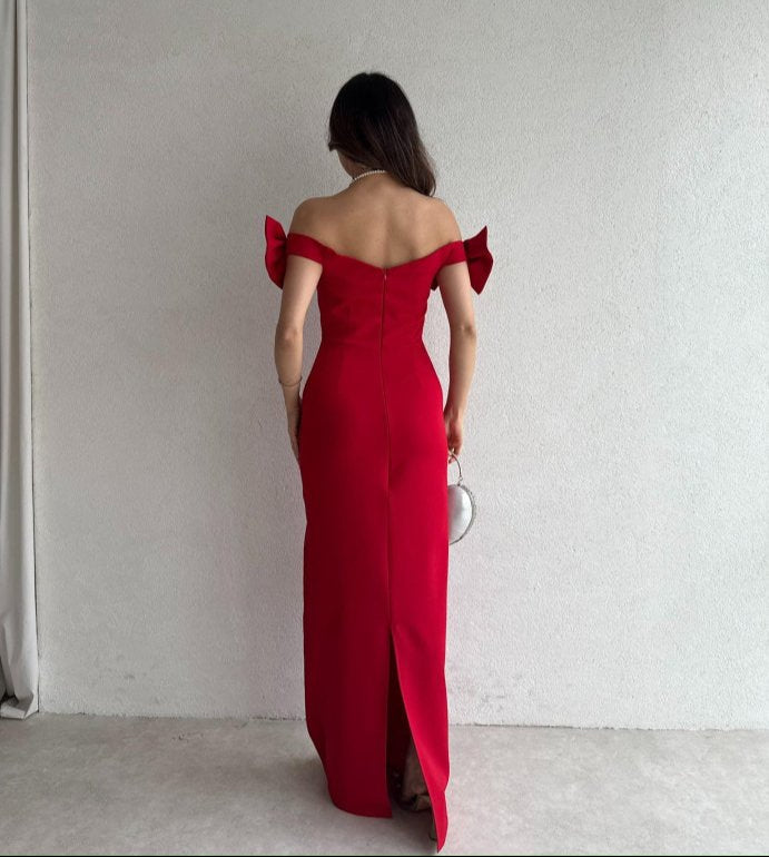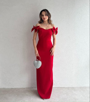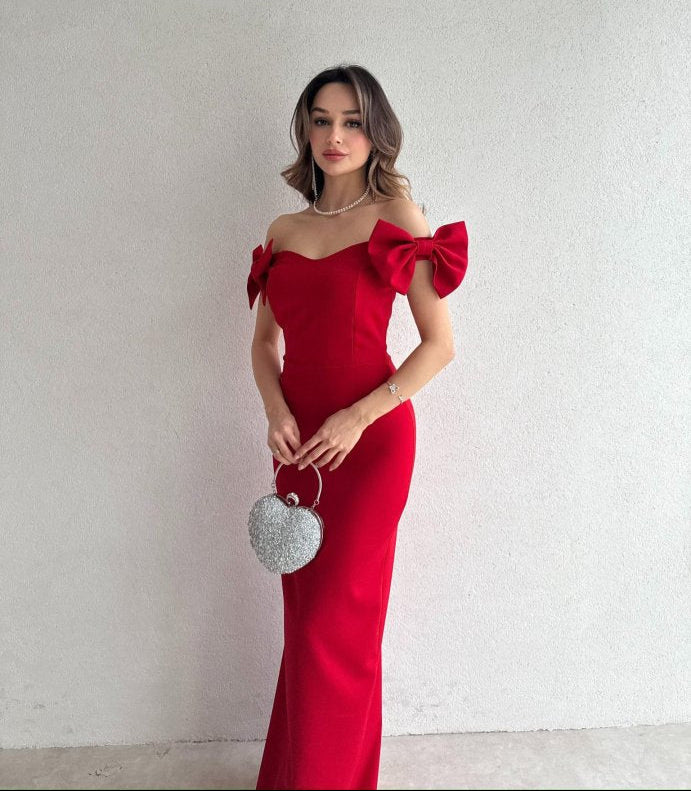 Тази дълга вталена рокля с голи рамене и 2 апликации с панделки е идеална за официални събития и специални поводи. Изисканият ѝ дизайн и романтичните детайли ще ви осигурят специален и запомнящ се външен вид, привличащ всички погледи.