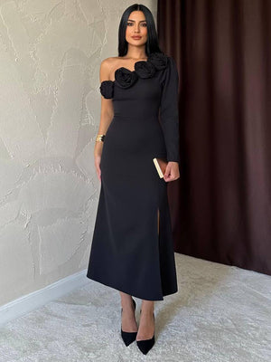 Тази миди рокля с отворено рамо, цепка отпред и рози, апликирани в областта на бюста, е очарователен избор за специални събития или романтични вечери. Неговият изтънчен и женствен дизайн ще ви накара да блеснете и да се чувствате прекрасно при всеки повод.