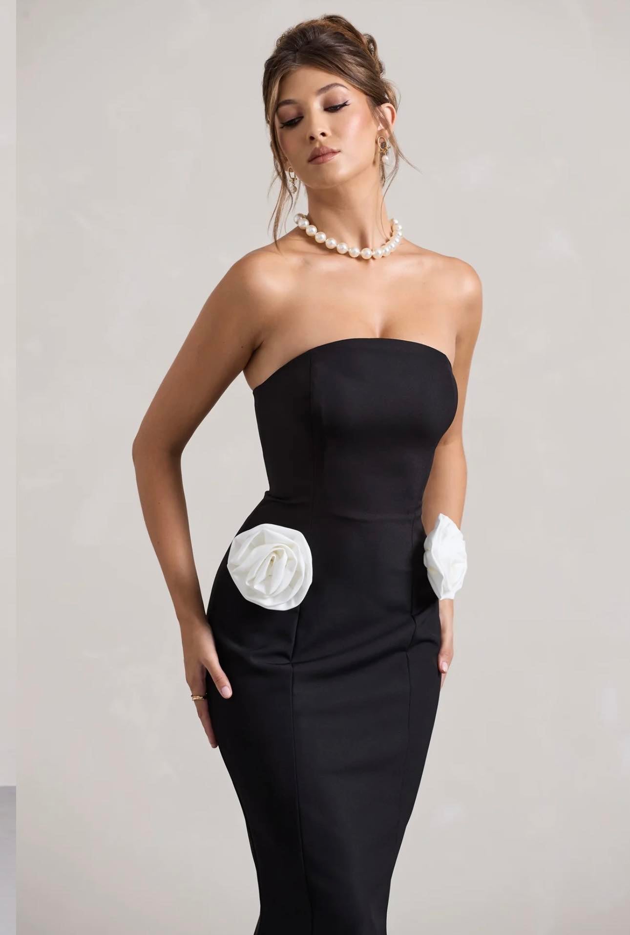 Вталената рокля без ръкави, в стил русалка, с две рози, апликирани в областта на талията, е очарователен и чувствен избор за специални събития. Ето подробно описание на тази елегантна рокля: