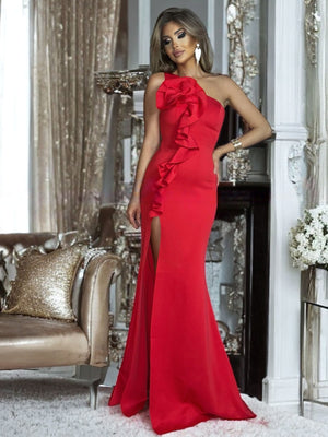 **Асиметричният дизайн** , с едно голо рамо, добавя чувственост и оригиналност, създавайки елегантна игра на линии и пропорции. **Обилната воланчена част в областта на бюста** добавя обем и динамика, привличайки вниманието и хармонично завършвайки линията на роклята.