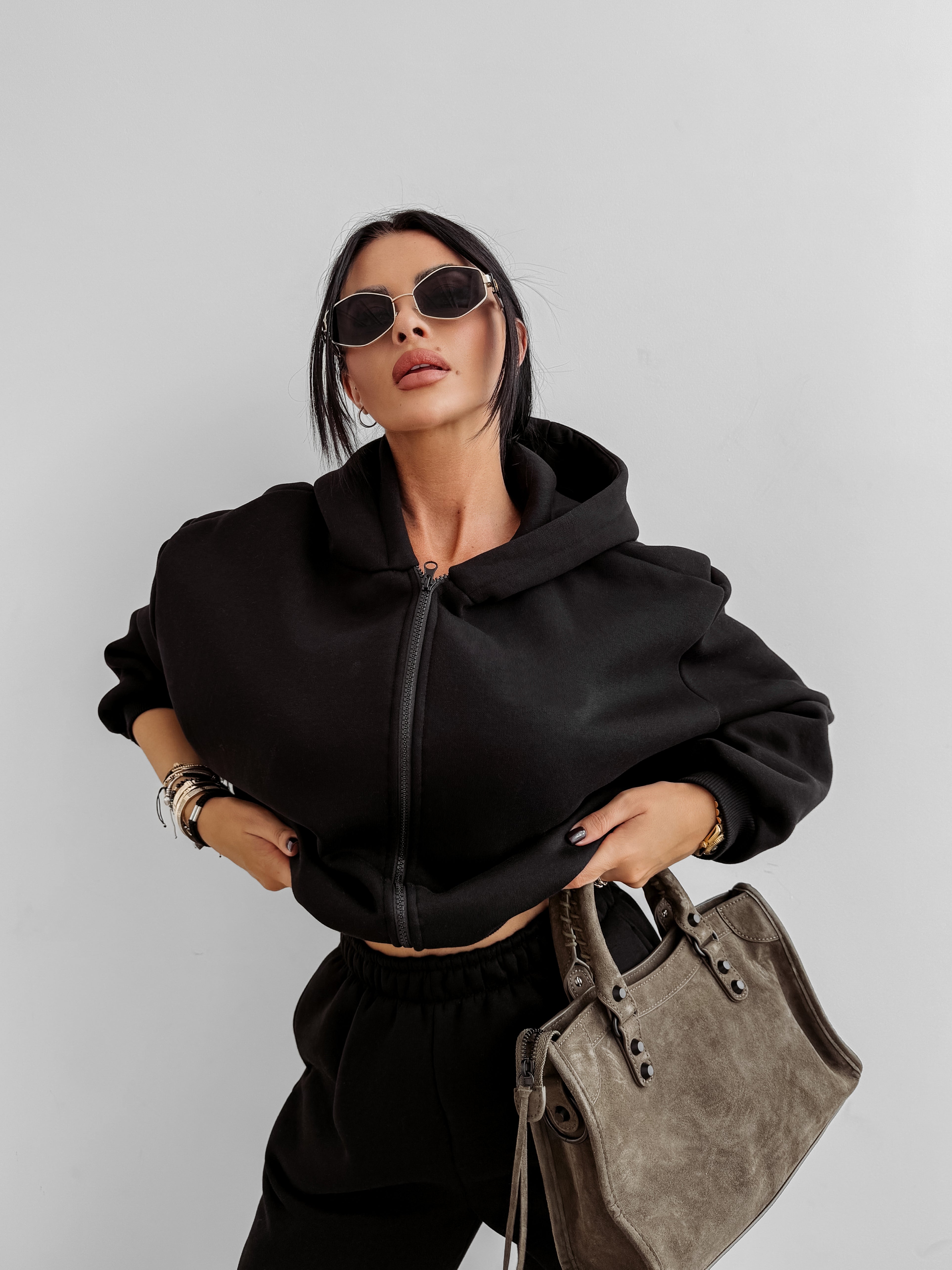 Суитшърт: Тип суитшърт с цип и висока яка, леко голям