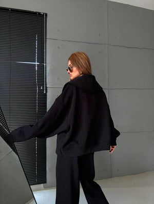 Превърнете всяка небрежна визия в момент на стил с черния анцуг Livia - комбинация от абсолютен комфорт и смела визия, идеална за дни, когато искате да се чувствате добре, но да изглеждате безупречно.