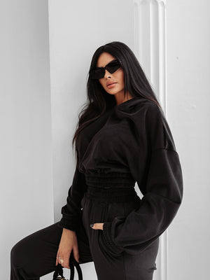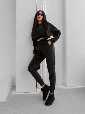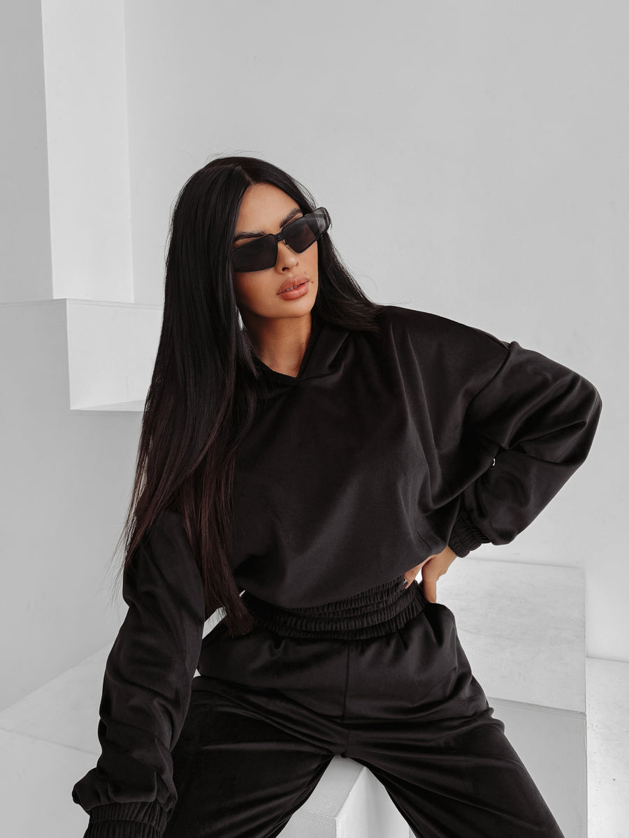 Черният анцуг Mona съчетава елегантността на кадифето с лекотата на модерния дизайн, идеален за дни, когато искате да изглеждате добре без усилие. Изработен от висококачествен мек кадифе , този комплект предлага мека текстура, приятна на допир и луксозен вид. Блузата е с къса кройка, с ластик на талията и ръкавите, а панталонът има ластик на талията и свободна кройка за пълна свобода на движение.