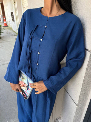 This elegant and casual set, consisting of a shirt and long flared pants, is made of **ayrobin** material, ideal for the warm season due to its light, airy and extremely comfortable texture.