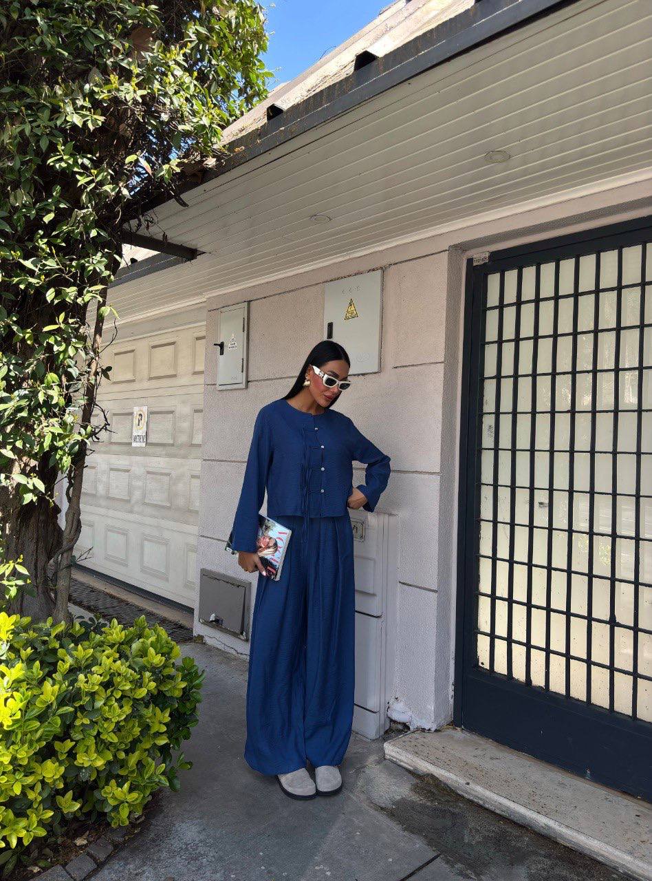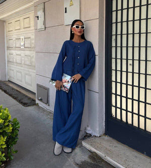 **The flared long pants** perfectly complete the set, adding an extra touch of elegance and optically elongating the silhouette. The elastic waist or discreet closure offers comfort throughout the day, and the flared cut ensures a fluid and refined effect with every step.