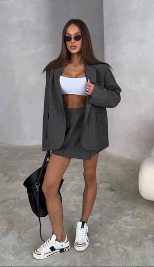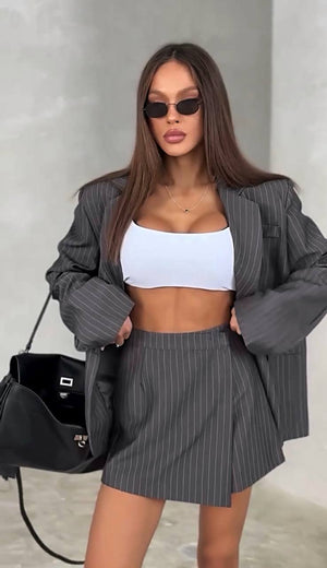 Elegant și modern, Costumul Alina Gri este alegerea perfectă pentru femeile care iubesc rafinamentul cu un aer fresh. Setul este format din sacou cu croi lejer și fustă mini cu talie înaltă, realizate dintr-un material de calitate cu dungi fine, ce oferă un look sofisticat și actual.